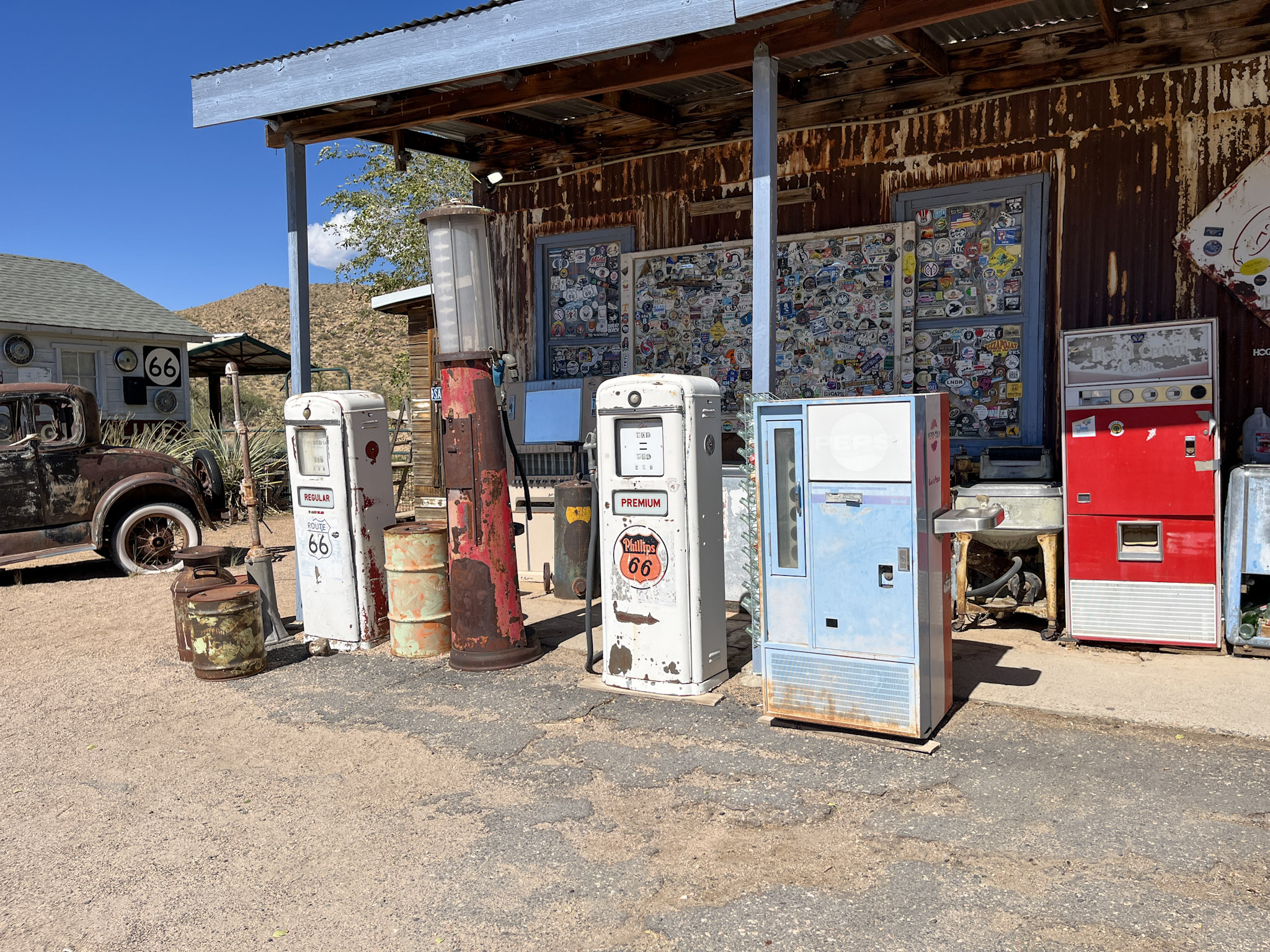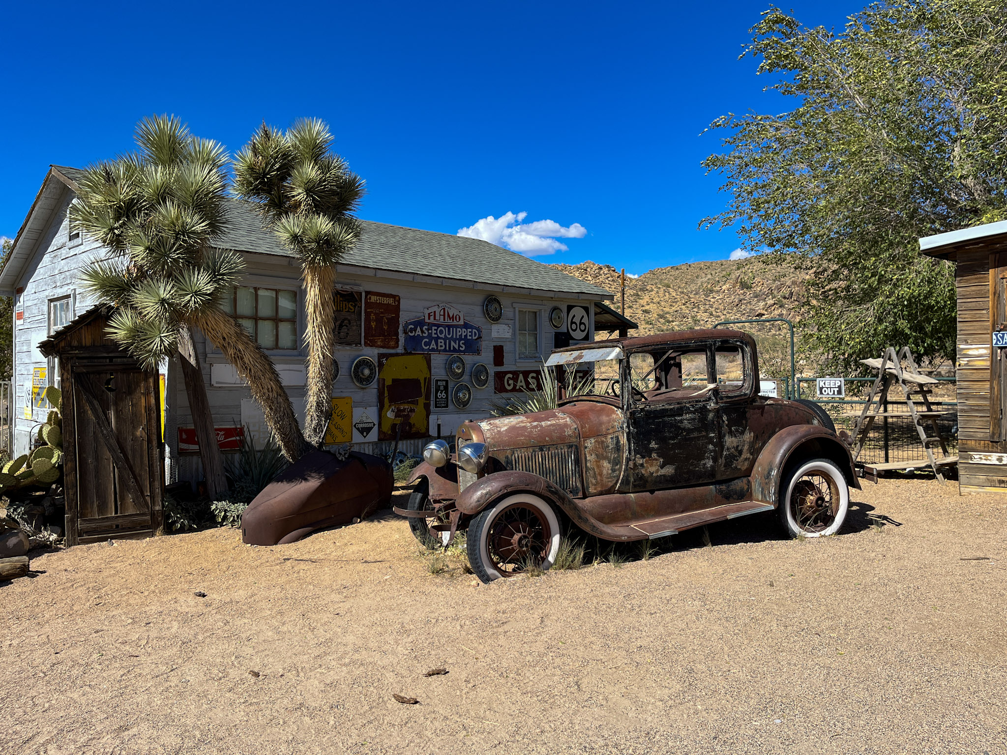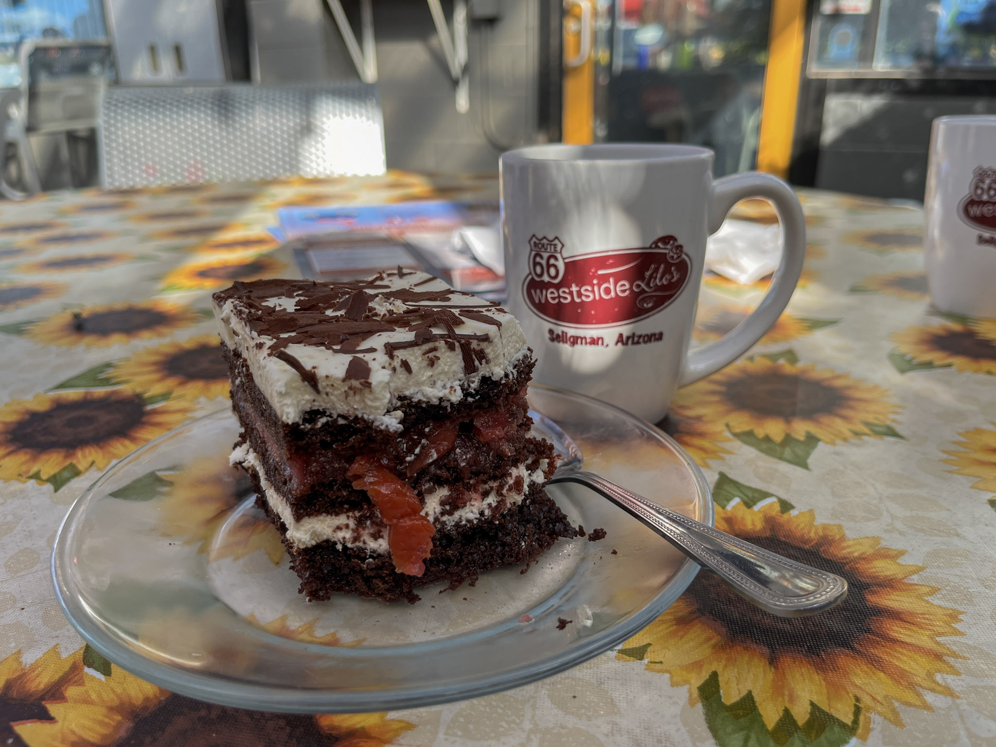 Auf der weiteren Fahrt folgen wir der alten Route 66, die sich wie ein Band durch staubige Hügel windet. Im kleinen Ort Seligman halten wir bei Westside Lilo’s Café, das von einer vor Jahren ausgewanderten Deutschen geführt wird – leider ist Lilo heute nicht da, aber ihr Apfelkuchen tröstet uns mehr als genug.