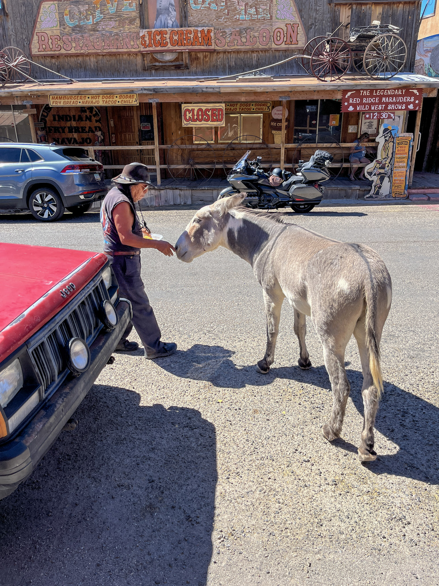 Danach weiter Richtung Oatman, ein staubiges Westernstädtchen auf der alten Route 66. Hier scheint die Zeit stehen geblieben zu sein – inklusive Wildesel auf der Hauptstraße und einer kleinen Westernshow mitten im Staub. Wir gönnen uns unser erstes Eis des Urlaubs und schauen einer Truppe Schauspieler zu, die sich mit Coltattrappen duelliert. Einfach herrlich.